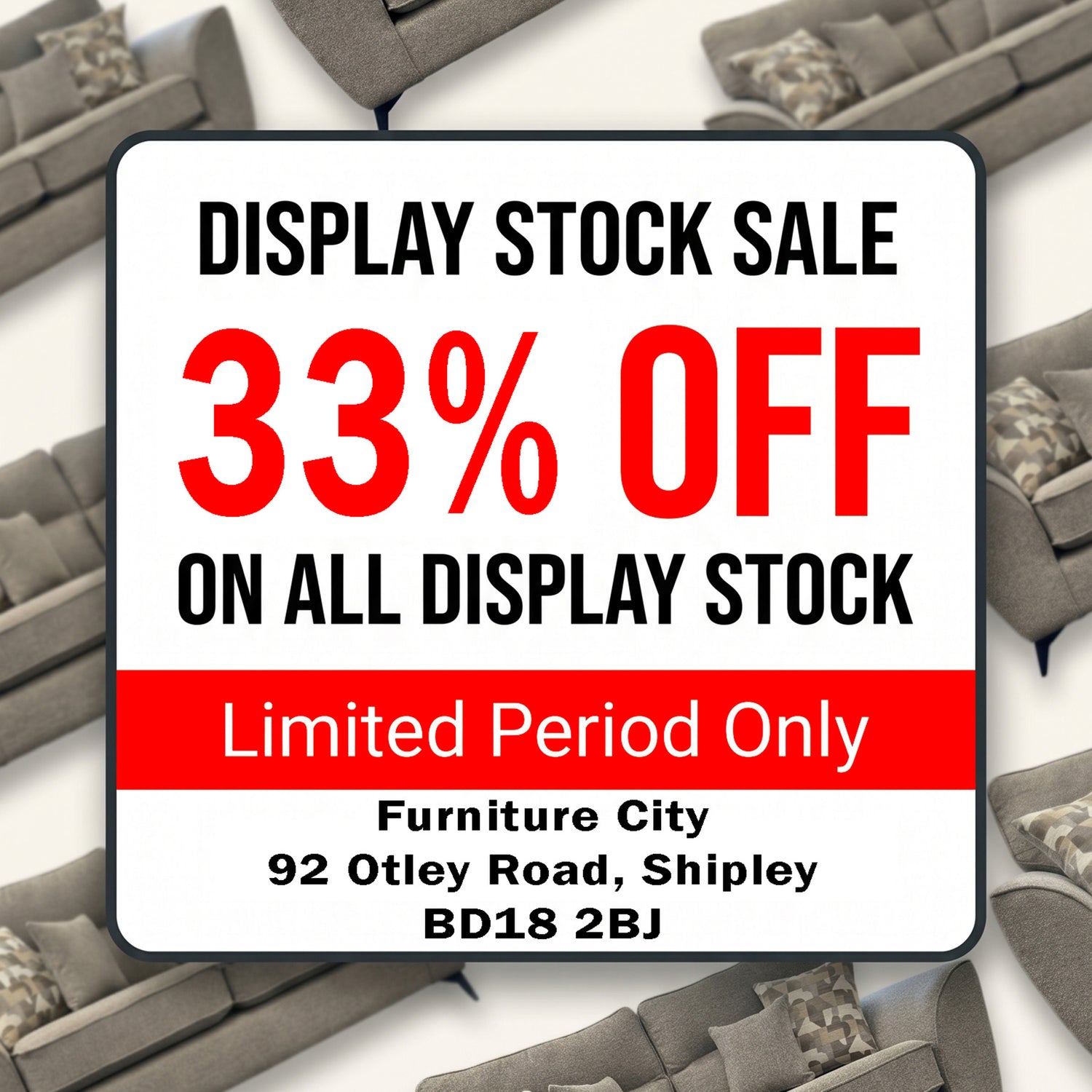 33% off of absolutely everything in our showroom display clearance. Save on sofas, corners, recliners, chairs and dining sets. Hurry down, it wont last long....