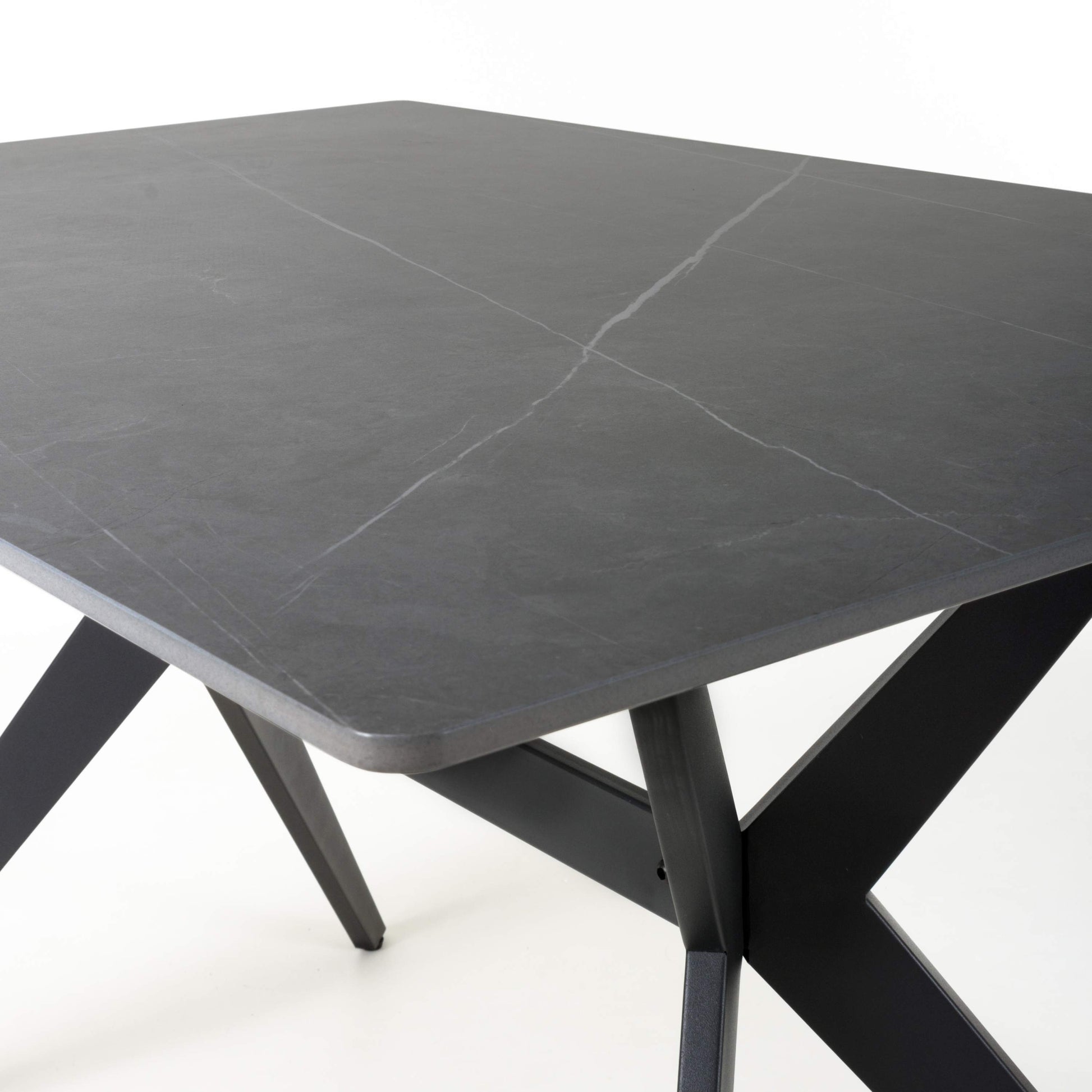 This trendsetting 1.2m sintered stone dining table is set off by fashionable diagonal orange and white criss cross markings. The sturdy 12mm thick ceramic table top comes in an attractive reflective black finish. Completed by stylish black powder coated metal X-frame legs. Assembly required. Sold individually.