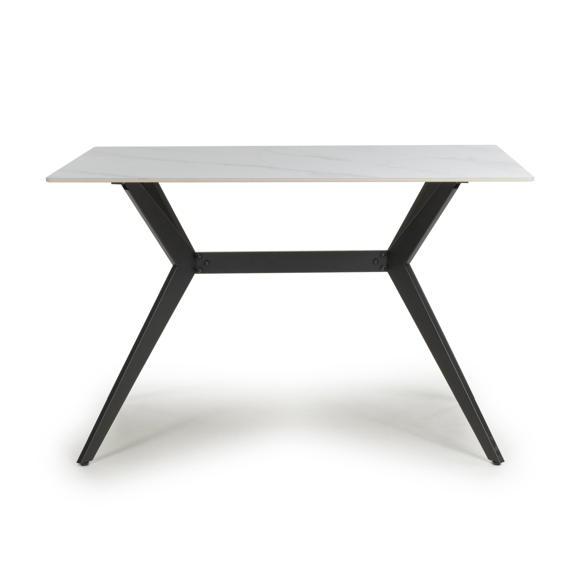 This trendsetting 1.2m sintered stone dining table is set off by fashionable diagonal orange and white criss cross markings. The sturdy 12mm thick ceramic table top comes in an attractive reflective black finish. Completed by stylish black powder coated metal X-frame legs. Assembly required. Sold individually.